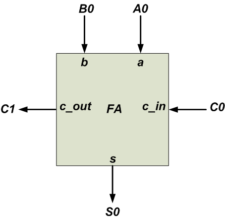 u1: FA port map (a => A0, b => B0, c_in => C0, s => S0, c_out => C1);Here, u1 is an arbitrary label for this component instantiation and FA specifies the component name. The notation a => A0 means that the a port of the FA component is connected to A0 from the main circuit. Similarly, we can use the following code to describe the leftmost FA in Figure 1.