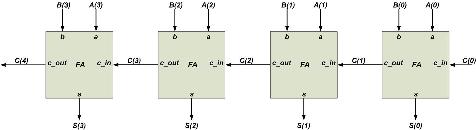 20 u4: FA port map (a => a(3), b => b(3), c_in => c(3), s => s(3), c_out => c(4));