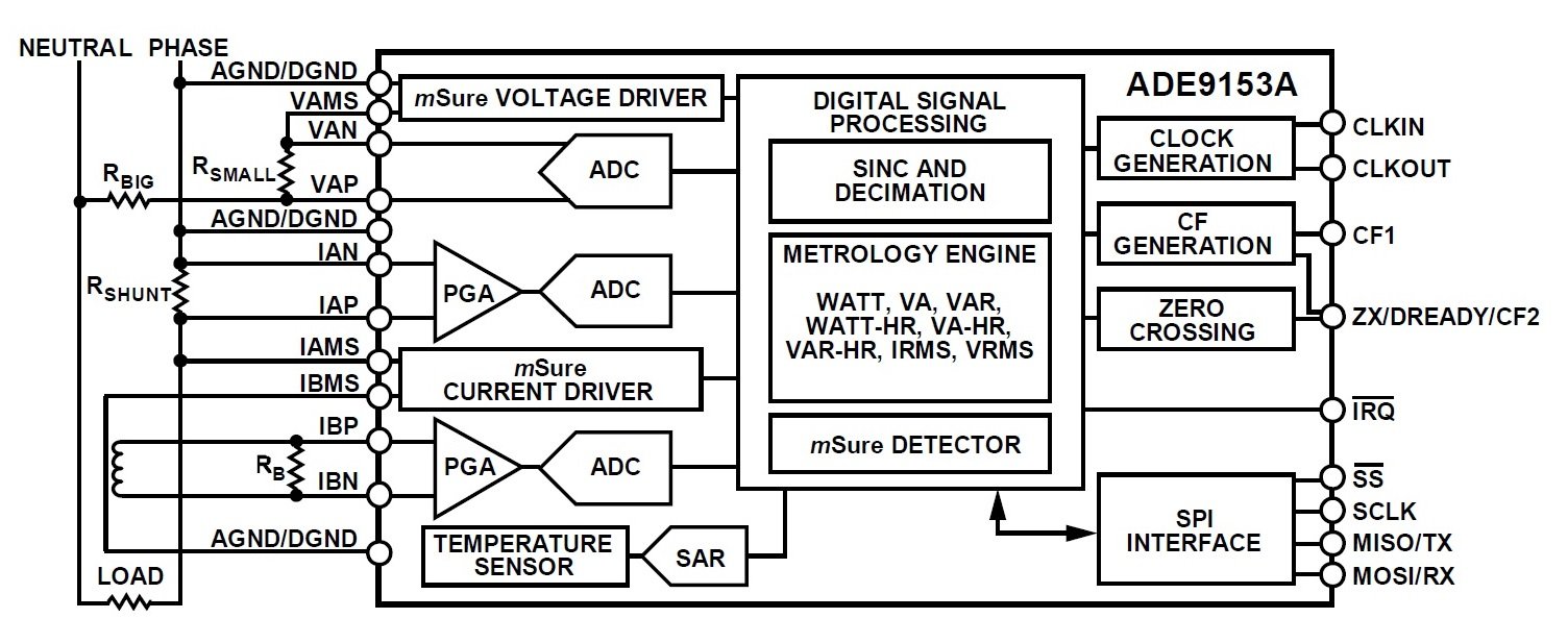 Analog Devices recently released the ADE9153A, which is a 5 × 5 × 0.75 mm 32-lead LFCSP (leadframe chip scale package) IC capable of taking highly accurate single-phase AC energy measurements. The device is highly integrated, as shown in the diagram below. The energy measurements are performed with the help of a current-sensing component (a shunt resistor or a current transformer).