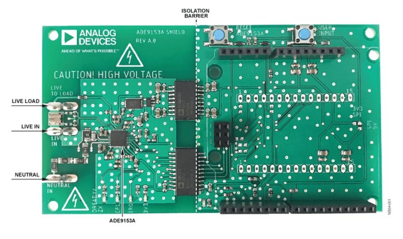The EV-ADE9153ASHIELDZ is a high-voltage Arduino-shield evaluation board. Be sure to use caution when testing with this PCB. Image taken from the evaluation board's user guide (PDF).