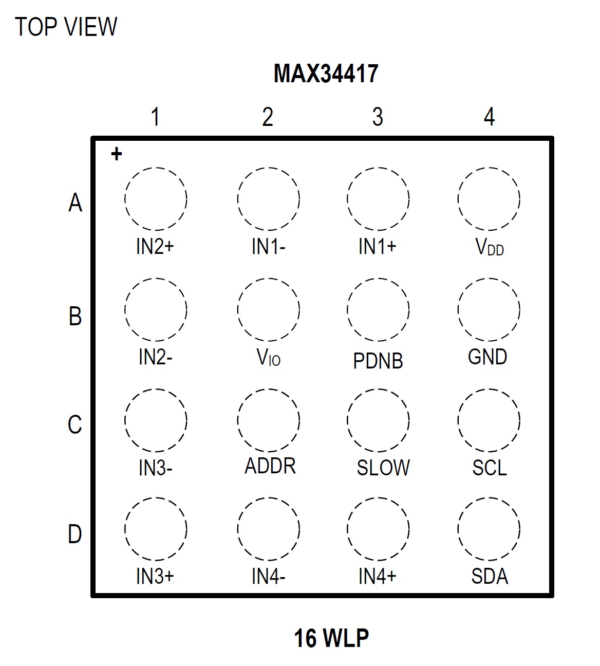 This IC is available only in a small wafer-level package with 16 bumps. Image taken from the datasheet (PDF).