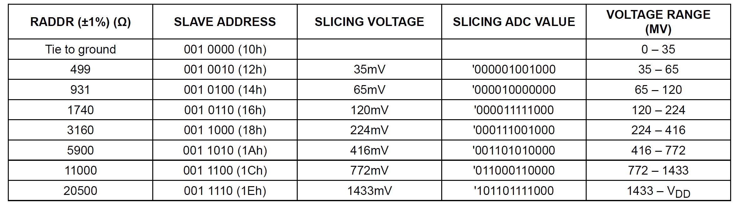This table from the datasheet explains how the single ADDR pin uses multiple voltage ranges for determining the IC's slave address.