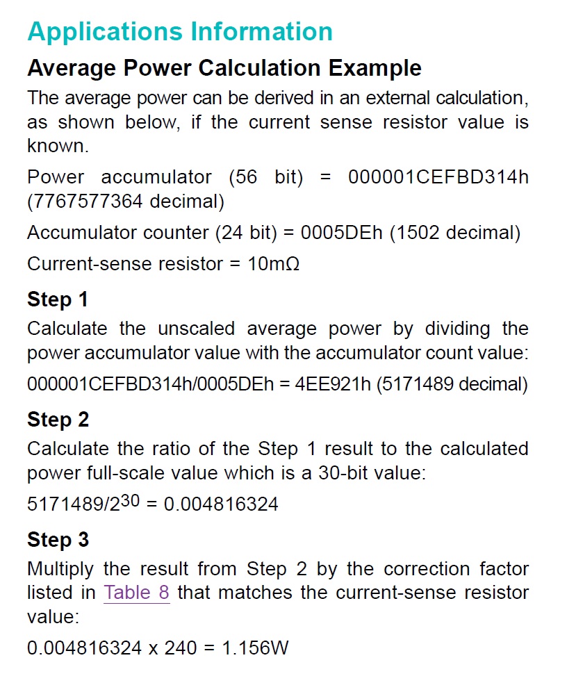 Within the Applications Information section of the datasheet (page 18), Maxim describes a fairly straightforward three-step process for calculating average power based on the IC’s accumulated power value, the accumulation count, and the “correction factor” corresponding to the value of the current-sense resistor (see the two figures below).