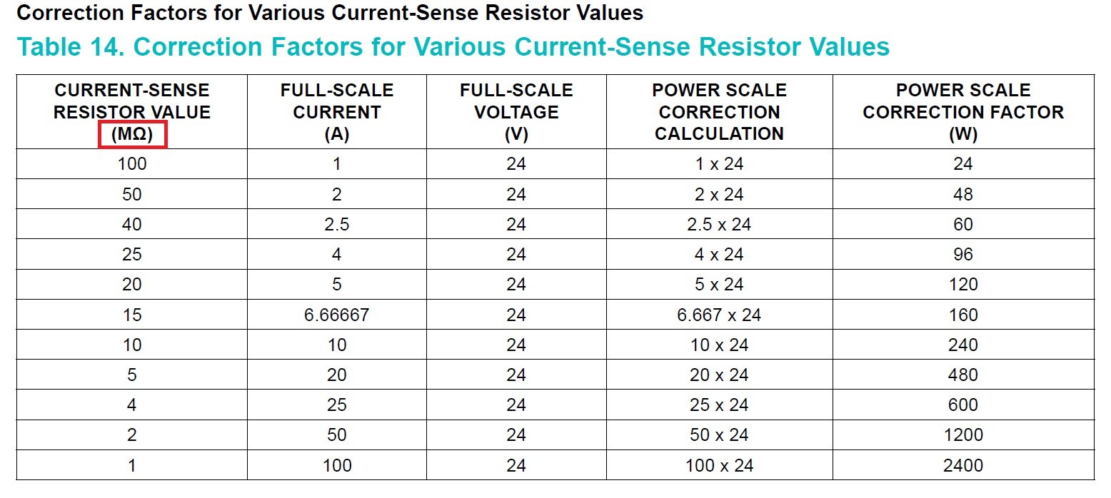 This correction factor table is used when calculating average power. Note that the current-sense resistor value unit should be "mΩ" (milliohms). From the datasheet (PDF).