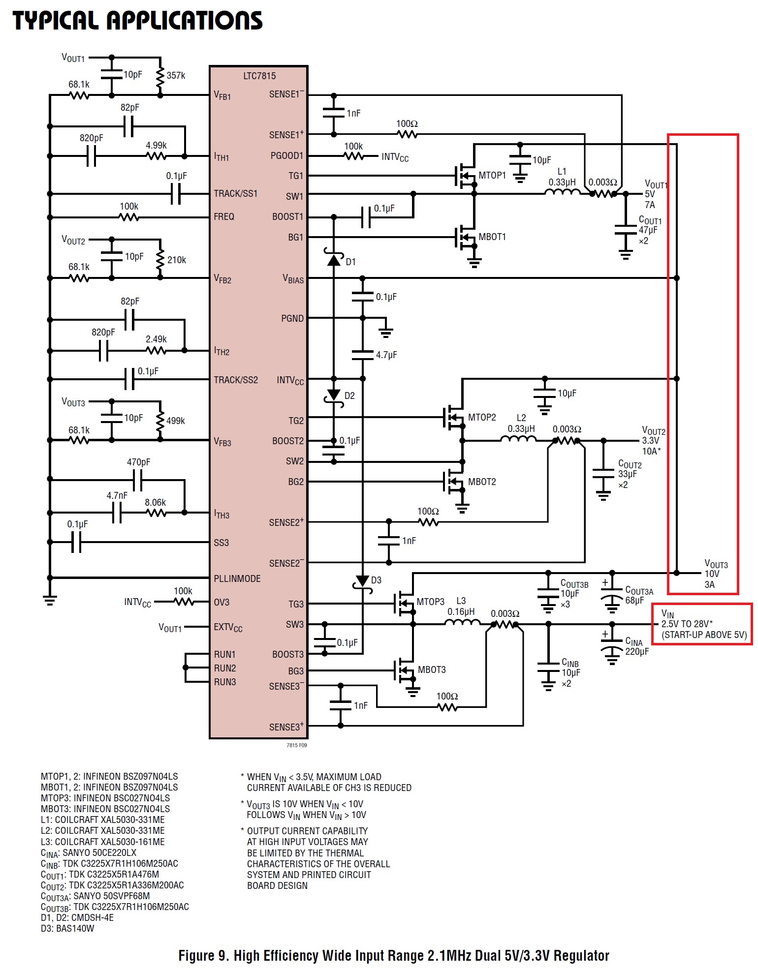 The LTC7815 configured such that the boost regulator's output voltage (VOUT3) feeds the two buck regulators. Drawing taken from the datasheet (PDF).