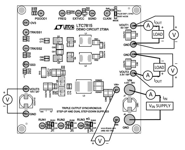 Interested in trying out this new buck/buck/boost controller? The LTC7815 has an accompanying evaluation board (see the figure below). Linear Tech has provided a demo board manual as well as the eval board's schematics and design files.