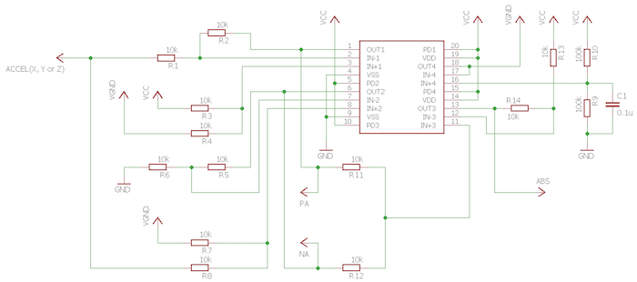 Ratiometricity refers to the ability of the transducer to maintain a constant sensitivity over a range of supply voltage values. The accelerometer signal output offset voltage and sensitivity will scale linearly with applied supply voltage. The input of Block 2 also considers the accelerometer offset reference. Figure 8 shows a circuit diagram for performing absolute value function and amplification. The VGND circuit point scales linearly with applied supply voltage. Thus, ACCEL and VGND will have very close offset reference meaning that the virtual “zero volts” read from ACCEL will be very close to the the virtual “zero volts” of VGND reference. Thus, a circuitry for calibrating at ACCEL circuit point is only required if the offset error is not low enough.