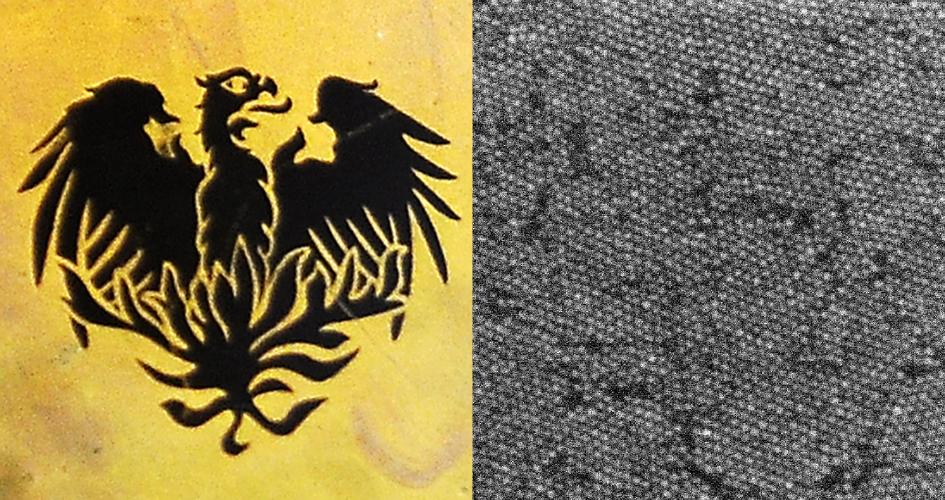 Left: A pattern developed by the researchers (about the size of a grain of rice). Right: The lead sulfide particles that make it up (each eight nanometers across). Image courtesy of Dmitri Talapin and Yuanyuan Wang via the University of Chicago