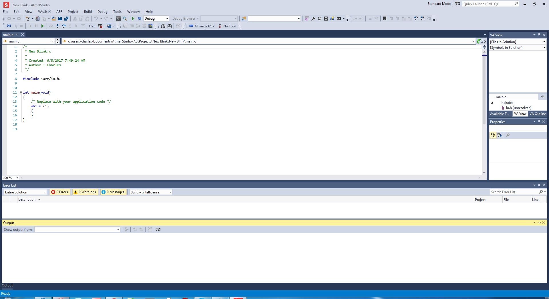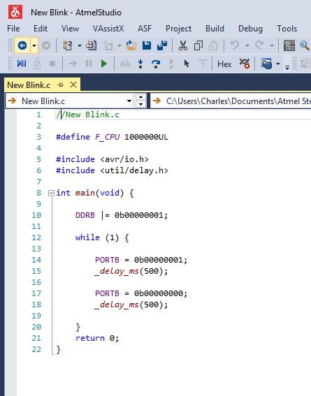 - Go to the New Blink.c window in Atmel Studio 7, select all the contents, and paste the contents of the clipboard into the New Blink.c window. It should appear as shown below.