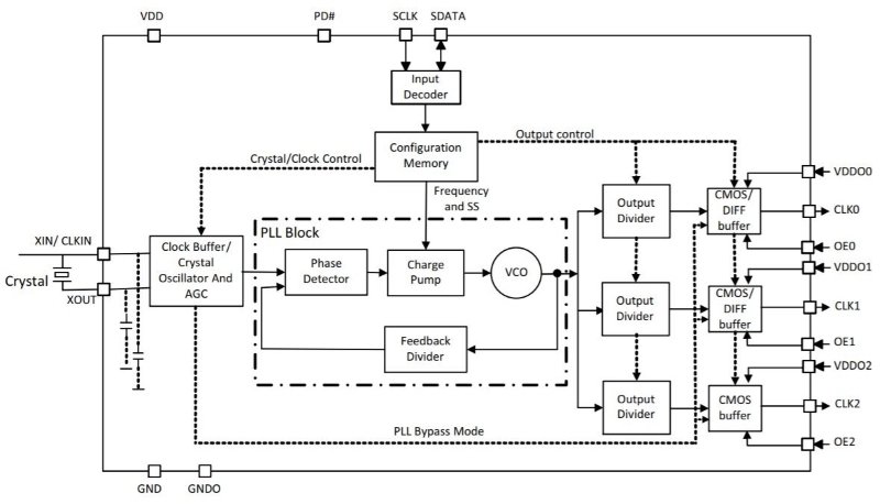 The general architecture of the device is fairly straightforward. The reference source is either a crystal or a single-ended digital clock. This signal goes to the phase-locked loop (PLL), and the output of the PLL is fed to three dividers that provide the three output clocks. The various customizable aspects of the device are controlled via an I2C communication interface. Notice that each output clock has its own VDD pin; the voltage applied to these pins governs the logic-high level of the corresponding clock. This is a handy feature, because it eliminates the need for logic-level translators in systems that have components operating at different supply voltages.
