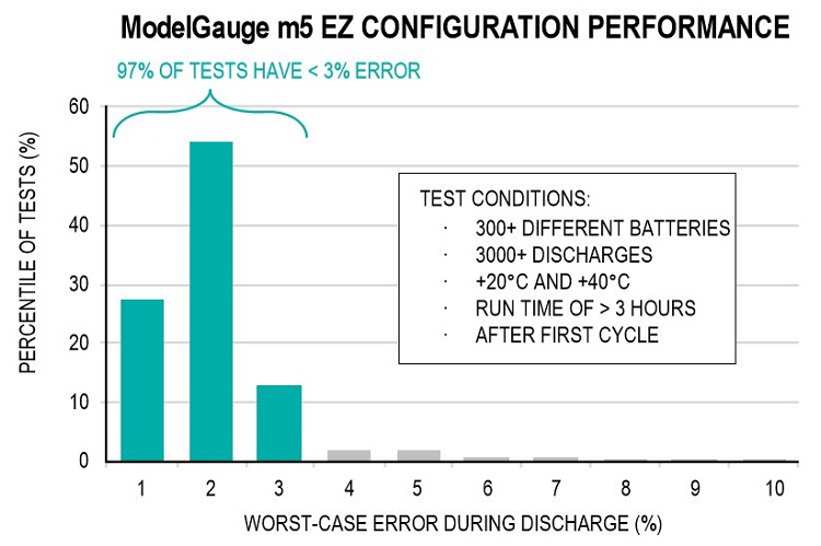 The MAX17055’s adaptability seems rather impressive to me. There are lots of different lithium batteries, and of course their exact discharge characteristics will vary. Maxim’s m5 EZ algorithm is usually able to produce accurate SOC estimates even when the designer does not attempt to customize the chip’s operation according to the battery’s particularities.