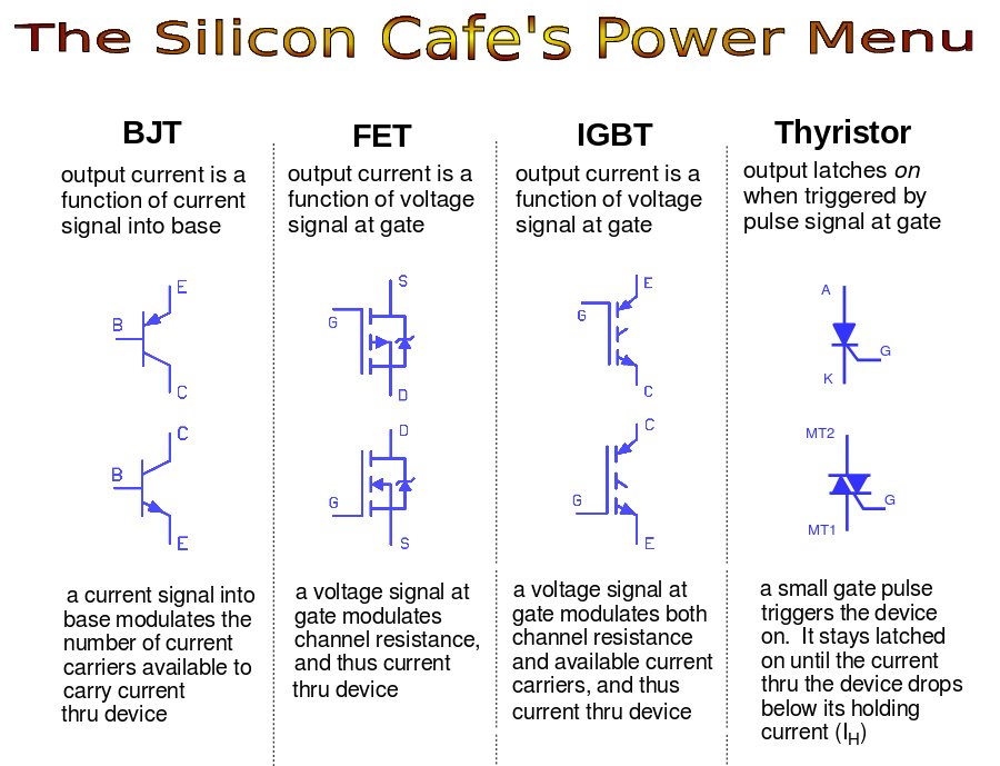 The entrée list includes not only popular high-power transistors like MOSFETs, BJTs, and IGBTs, but also more exotic thyristor fare like Triacs and SCRs (for the restricted palate of AC-only or pulsating DC diets, which we will address in a future article).