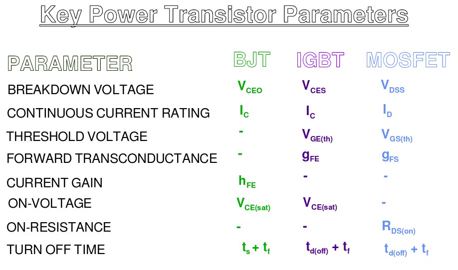 The key parameters for comparing power transistors are shown in the following table: