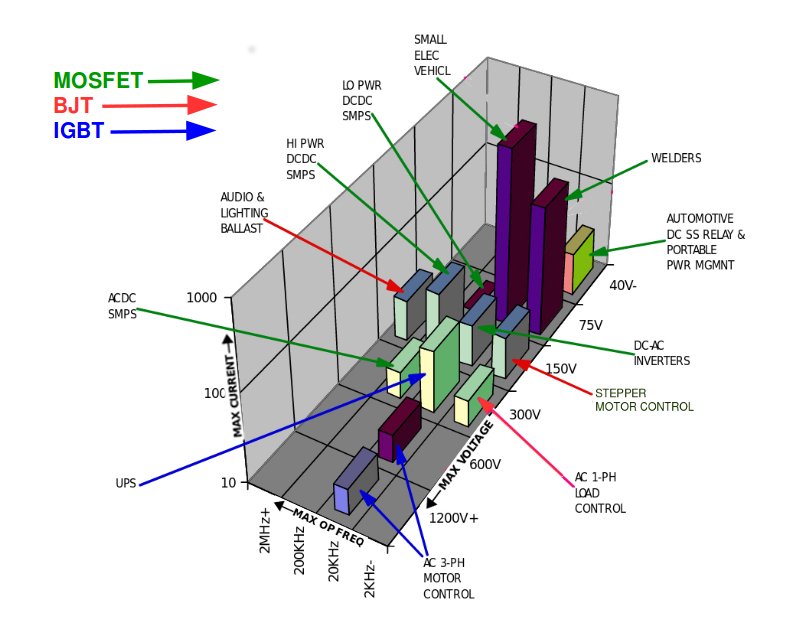 For example, at the top of the graph, you will note a bar representing small electric vehicle applications (e.g., golf carts, electric forklifts). The motor controllers in these typically operate at voltages from 48V to 72V and currents up to several hundred amps, and they commonly utilize MOSFETs PWM'ing the motor at frequencies around 20 kHz (comfortably above human hearing).