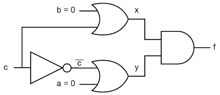 When a and b are both 0, input c can change between the 0 and 1 states without changing the “final” value for f. However, due to the differing propagation delays for certain circuit implementations, there is the potential for a static-0 hazard.