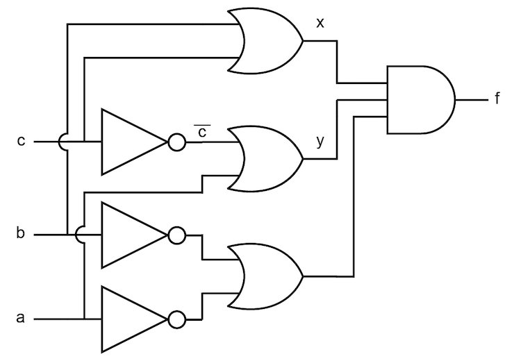 We will assume that all gates have the same propagation delay time constant d. In the timing diagram of Figure 3, inputs a = b = 0. One gate delay after input c changes from a logic 0 to 1, outputs c’ and x also change state. Since both x and y are now (temporarily) set to 1, this causes a subsequent change on the final output f from 0 to 1.