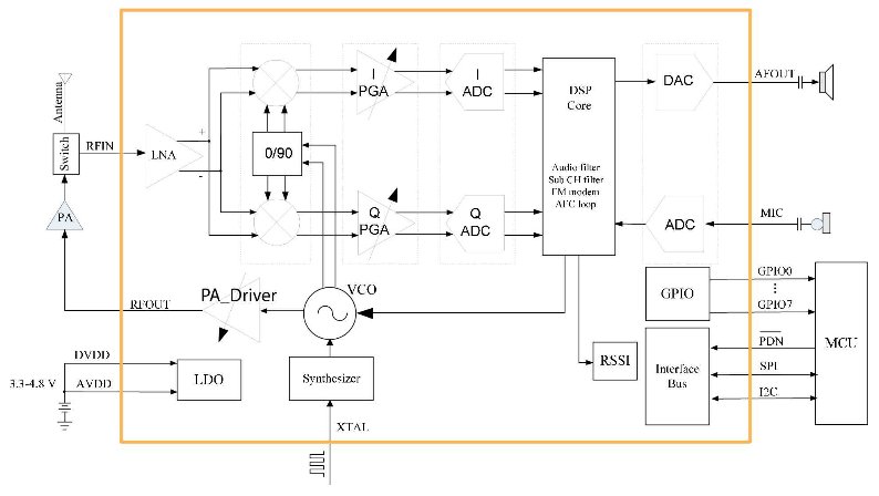 AT1846 Transceiver IC block diagram from its datasheet. Image courtesy of RDA Microelectronics. Click to enlarge.