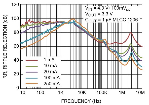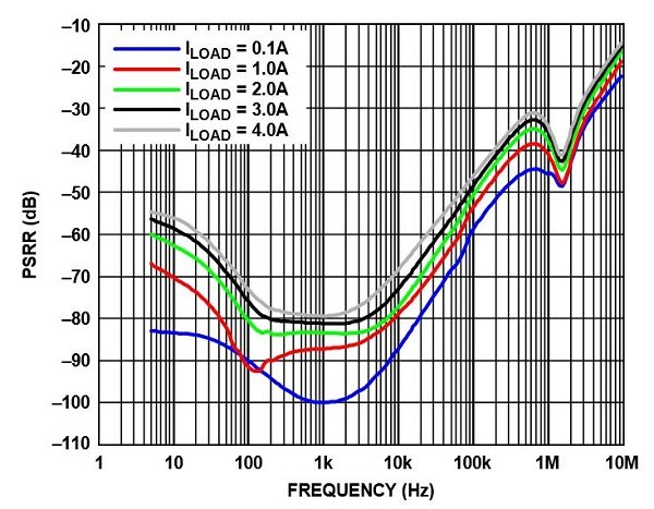 This regulator is also a good option when you need to suppress noise generated by a switcher. As you can see in the following plot, the PSRR is a little bit better than that of the ADP1764 for frequencies around 1 MHz.