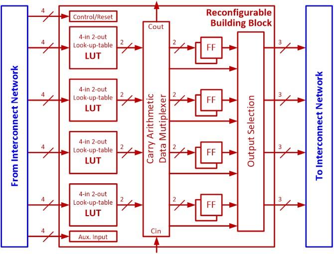 In the Flex Logix EFLX arrays, the LUT is a dual 4-input LUT that can be combined to form a 5-input LUT. The LUT outputs are optionally storable in a flip-flop. LUTs are typically grouped into groups of four with carry logic to facilitate adders and shifters.