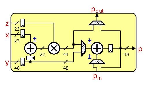 In the Flex Logix EFLX array, there is a 22-bit pre-adder, a 22x22 multiplier, and a 4-bit post-adder/accumulator. MACs can be combined or cascaded to form fast DSP functions.
