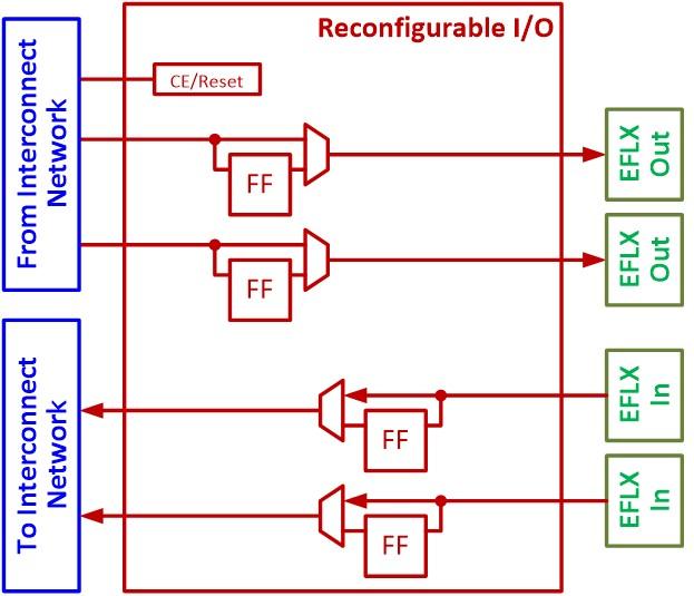 Each EFLX IP core has an extra top-layer of interconnect which allows one core to connect automatically to surrounding neighbors to make a large array up to NxN.
