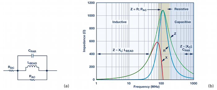A ferrite bead can be modeled as a simplified circuit consisting of resistors, an inductor, and a capacitor, as shown in Figure 1(a). RDC corresponds to the DC resistance of the bead. CPAR, LBEAD, and RAC are (respectively) the parasitic capacitance, the bead inductance, and the AC resistance (AC core losses) associated with the bead.