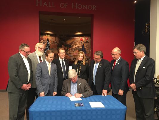 Governor Rick Snyder signing bills 995, 996, 997, and 998. Image courtesy of Detroit News.
