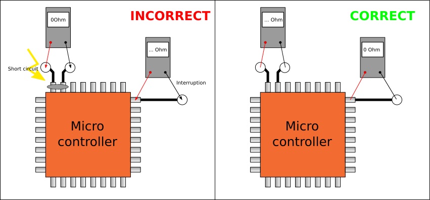 When you have everything soldered, clean it up with your preferred cleaner. Do a visual inspection (a microscope or magnifying glass is helpful here, especially with fine-pitch components), and use your multimeter to check any connections that you are concerned about. As shown in the following diagram, you can use the multimeter's resistance-measuring feature to assess your solder connections.