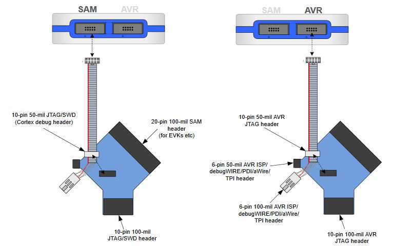 Example of a flash/debug adapter with two connector options. Image courtesy of Atmel.