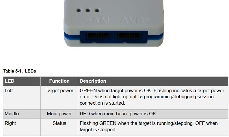 The flash/debug adapter will usually have status LEDs that give you some sort of information about what is happening inside—e.g., the device is powered but idle, programming is in process, the microcontroller is executing code in debug mode. The following image gives you an example of flash/debug status LEDs.