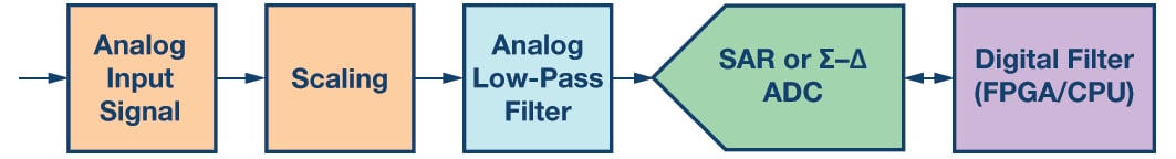 This article discusses the design challenges and considerations associated with implementing analog and digital filters into the ADC signal chain to achieve optimum performance. As shown in Figure 1, the data acquisition signal chain can utilize analog or digital filtering techniques, or even a combination of both. Since precision SAR and Σ-Δ ADCs are commonly sampling within the first Nyquist zone, this article will focus on low-pass filters. It is not the intent to address specific low-pass filter design techniques in this article but rather their application in ADC circuits.