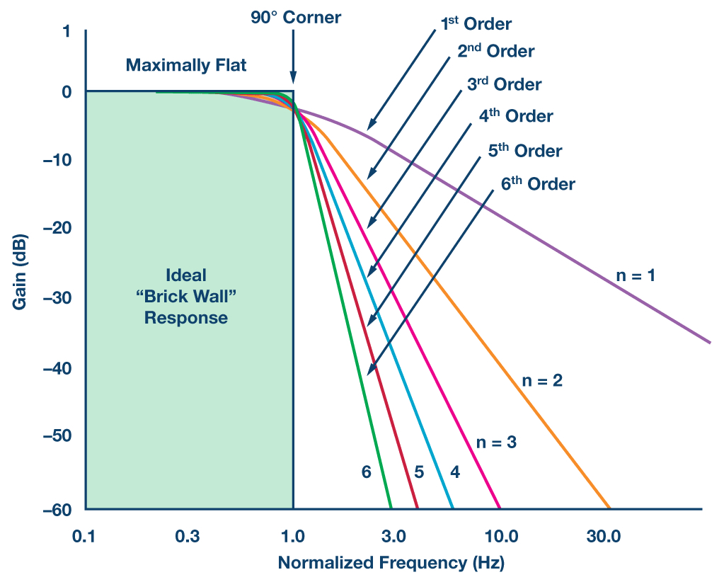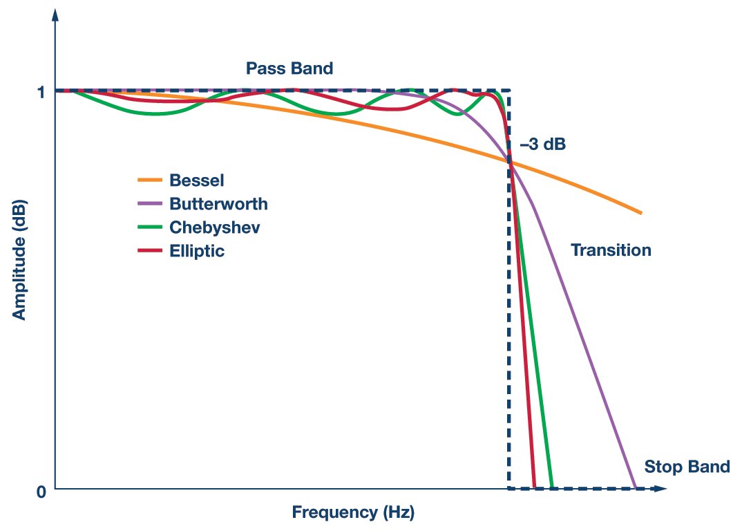 Ideal low-pass filters should have a steep transition band and excellent gain flatness in the pass band as shown by the brick wall dashed line in Figure 2. Furthermore, the stop band attenuation should reduce any residual out-of-band signal to zero. The response of some commonly used practical filters are shown in the colored lines in Figure 2. If the pass band gain is not flat or exhibits ripples, this response may scale the fundamental signal. The attenuation of the stop band is not infinite, which limits screening the noise out of band. There can also be a transition band without steep falloff, which degrades noise attenuation around the cutoff frequency. In addition, all non-ideal filters introduce a phase delay or group delay.