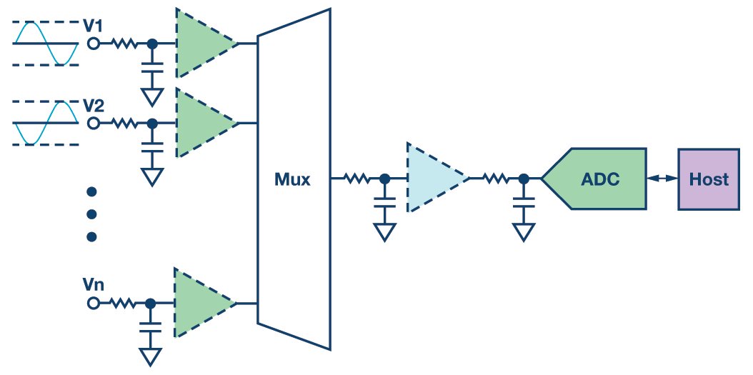 One single filter after the mux can be used for the channels, which makes the design simpler and the cost lower. As discussed above, analog filters invariably introduce settling time. Every time the mux switches between channels, this single filter has to be recharged to the value of the selected channel, thus limiting the throughput rate. For a faster throughput rate, one filter for each channel in front of the mux can be an option, but this entails a higher cost.