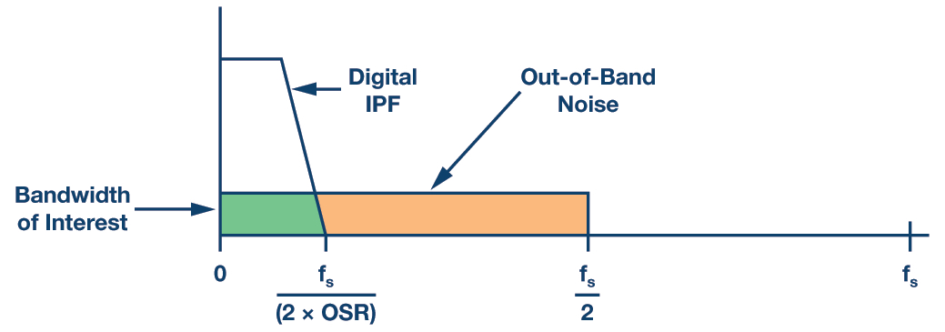 Utilizing oversampling and a decimation filter, the SNR improvement can be derived from the theoretical SNR for an N-bit ADC: SNR = 6.02 × N + 1.76 dB + 10 × log10[OSR], OSR = fs/(2 × BW). Note that, this formula only applies to ideal ADCs in which there is only quantization noise.