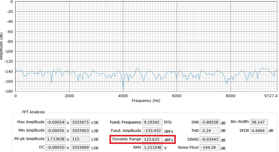 As shown in Figure 8, the measured oversampled dynamic range shows a 1 dB to 2 dB degradation from the theoretical SNR improvement calculation. Because the low frequency noise coming from the signal chain components limits the overall dynamic range performance.