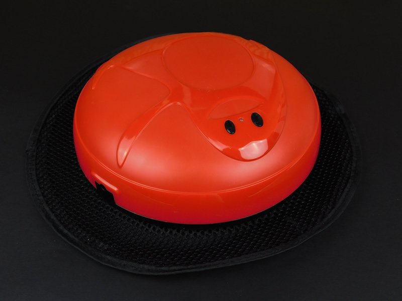 The outside of the robot shows a large material flange that holds onto the dusting material that uses “electrostatic forces” to attract dirt off the floor. Two buttons are on top of the device, both of which start the robot with an LED for power indication. The LED flashes red when there is not enough power in the robot to operate.