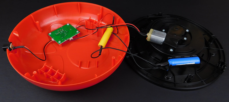 The inside of the robot reveals a very minimalist design. The whole unit uses four screws to hold the two halves together and four screws for the PCB. The batteries and DC charging jack are not glued or screwed into place. Instead, they rely on protrusions on the lid to prevent them from moving around when the unit is screwed together.