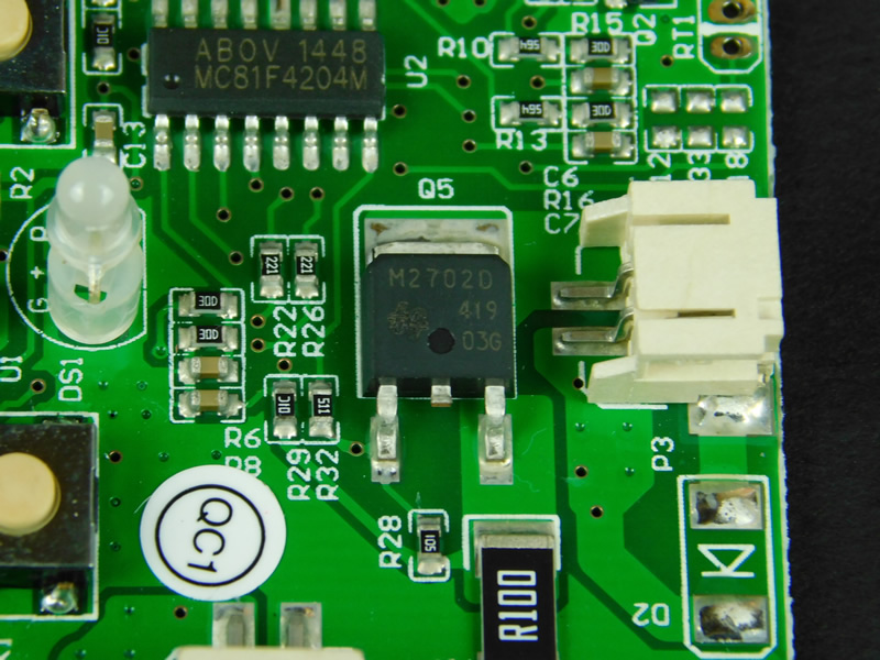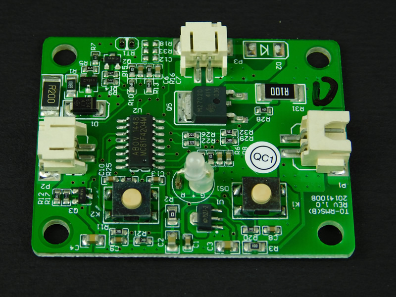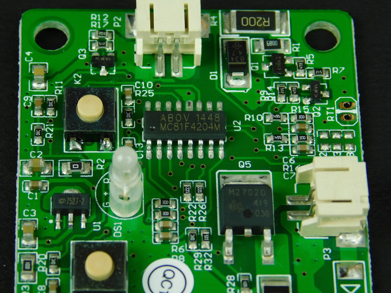 Cheaper products typically use low-cost PCBs that have faded solder masks, thin PCB material, and poor component legend layers. This PCB, however, shows a very thick solder mask layer, dense FR4 stock, and a clear legend.