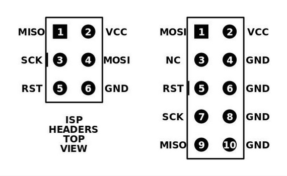 An example of 10-pin and 6-pin pinouts for in-system programming (ISP) headers. Image courtesy of osiixy (own work) [CC BY 3.0]