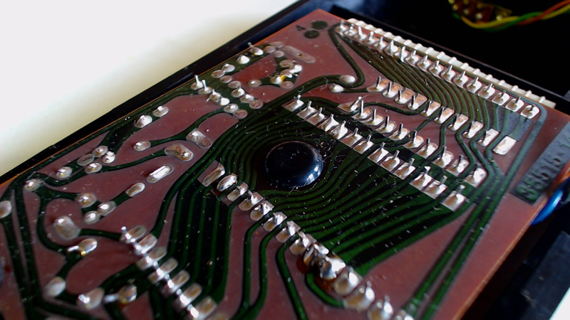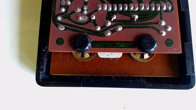 The PCB is made of a paper-based epoxy material (FR2) and only has solder mask on copper. The Sinclair logo can be seen on the bottom of the main PCB that holds the processor.