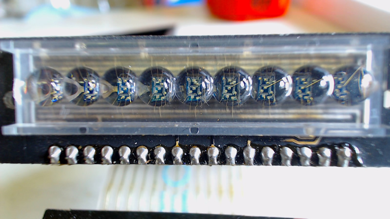 This close up of the display shows the tiny wires that are connected to each segment of the digits. Chances are (due to their size) they are welded on via ultrasonic vibration (like normal ICs).