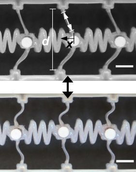 The research uses a chain of these bistable elements connected to one another by springs. When one of these arches goes from the concave to the convex state, its spring applies a force to the arch that is next downstream in the chain. Consequently, the next arch changes state and this goes on like dominos.