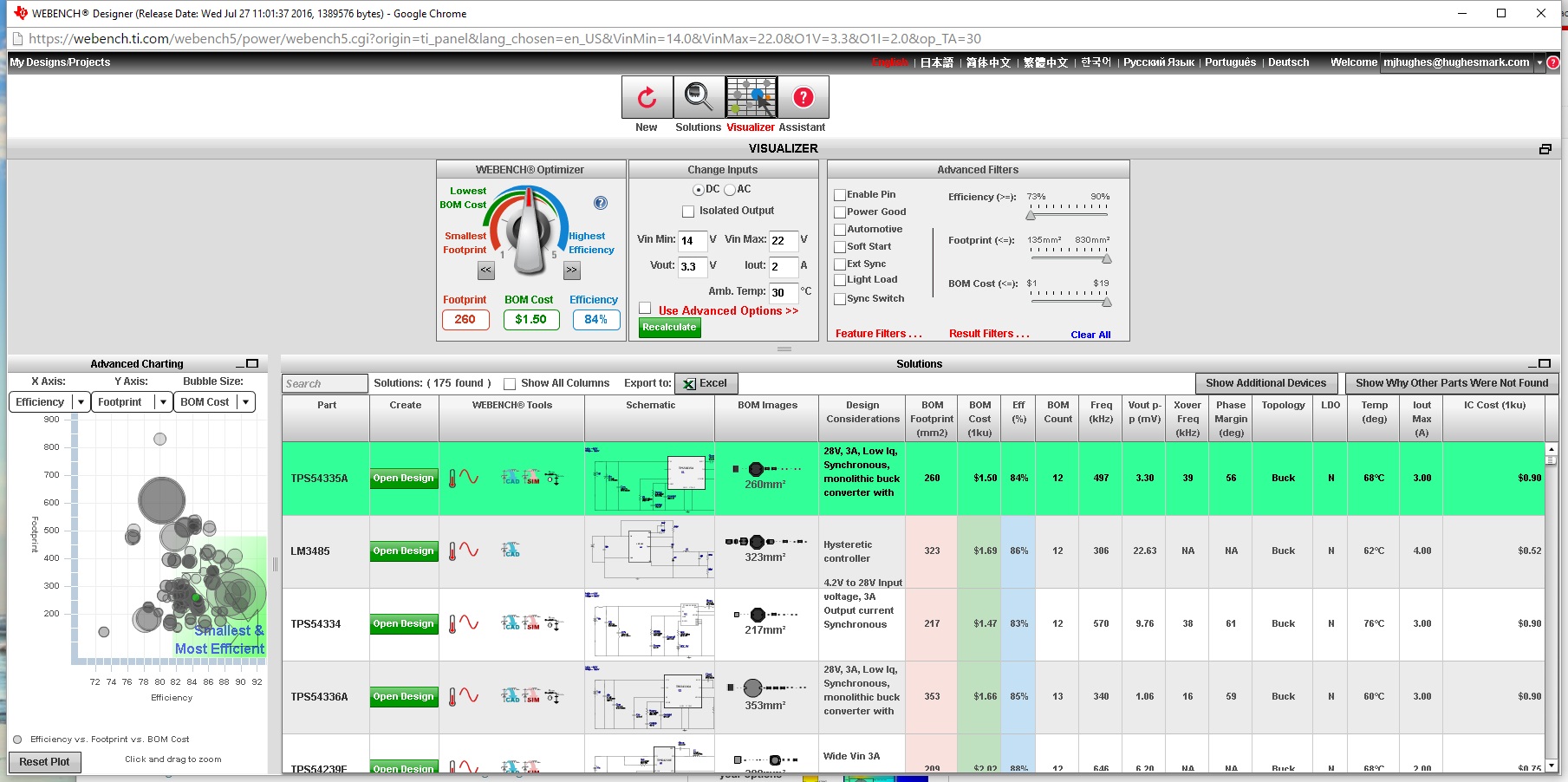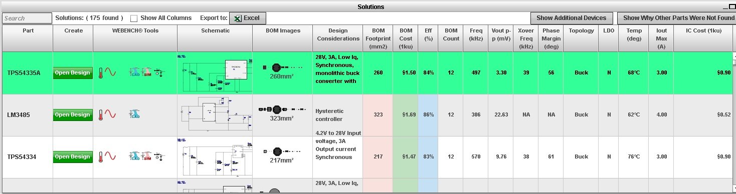 You'll be presented with a screen that allows you to drill down on designs based on efficiency, BOM cost, etc. Not all WEBENCH tools are available for all parts.