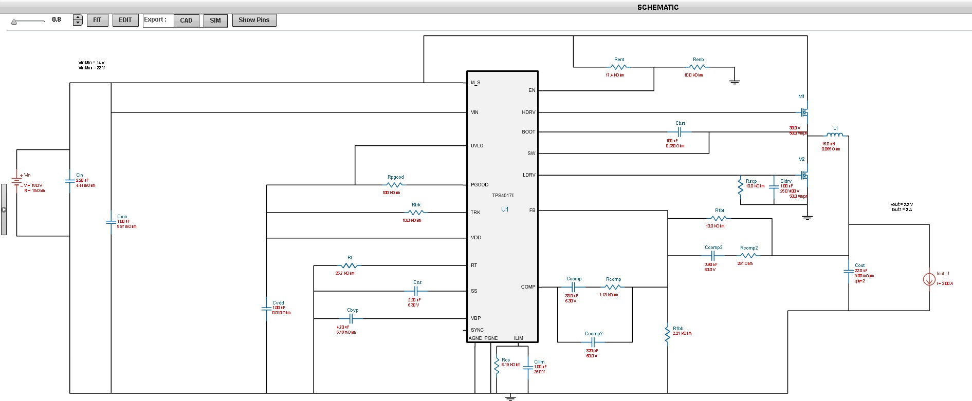 Input the minimum and maximum voltage range input for your circuit, and the desired output voltage and current and click "Start Design":