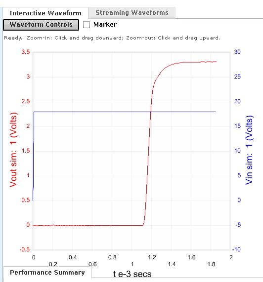 Here we see the startup analysis of the circuit. It takes approximately 0.0014 seconds to reach an operating potential difference of 3.3 V when a 17 V potential difference is introduced to the circuit.