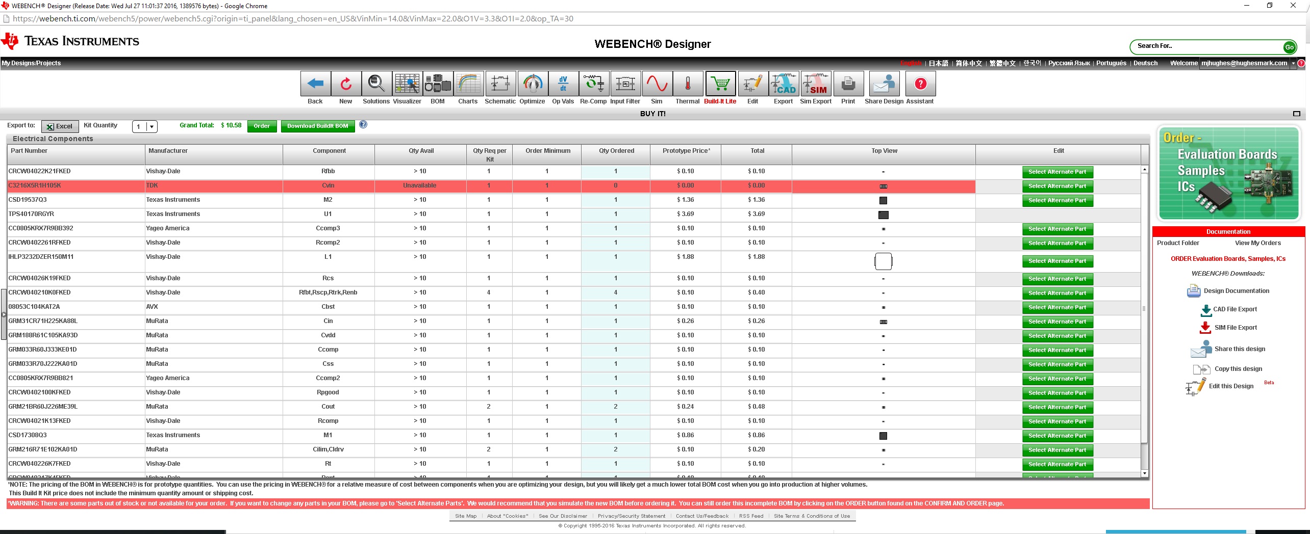 Click "Build-It Lite" to generate an order form for your Bill of Materials from TI's database. Click "Order" to begin the order process.