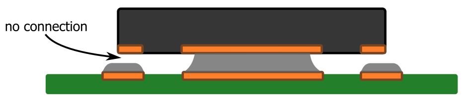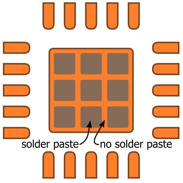The primary concern with a full-pad solder-paste application is “floating”—an excessive amount of solder between the thermal pad and the PCB can cause the entire component to float above the level at which the perimeter lands can make contact with their pads: