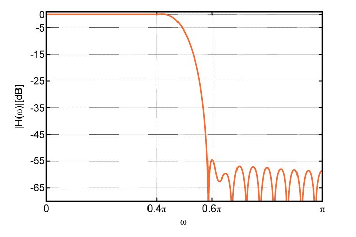 As discussed in the previous article in this series, the window method leads to the same ripple in the pass-band and stop-band. However, since Figure (1) uses a logarithmic scale for , the ripples in the stop-band seem to be larger. This is due to the fact that variation of a logarithmic function is much larger when its argument is close to zero.