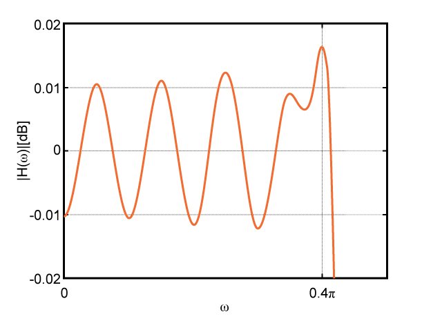 Although this figure shows a low-pass filter, the relations for the ripples are valid for other filter types. Considering Figure (3), we can find the pass-band ripple as . In this example, , hence .