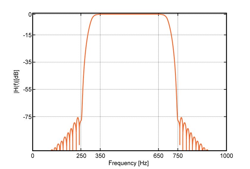 The frequency response of the designed band-pass filter is shown in Figure (6).